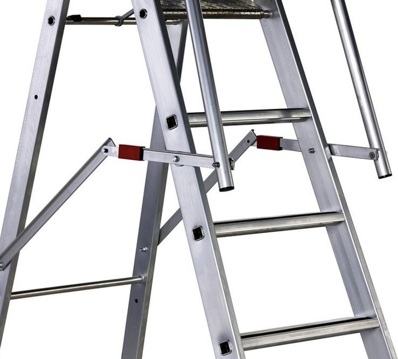 Perfekt til vedligeholdelse af maskiner, inspektion af højere installationer eller når elektrikere skal have begge hænder fri til ledningsarbejde. Den praktiske fralægningsskål på 420 x 200 mm holder værktøj og småting inden for rækkevidde. Med kun 10 kg og automatisk klapbart gelænder er stigen nem at transportere og opbevare - praktisk for både facility-afdelinger med begrænset lagerplads og håndværkere mellem jobsteder. De udskiftelige 2-komponent kunststofsko og muligheden for opgradering med ZAP støtteben gør Z600 til en investering, der kan tilpasses fremtidige behov.