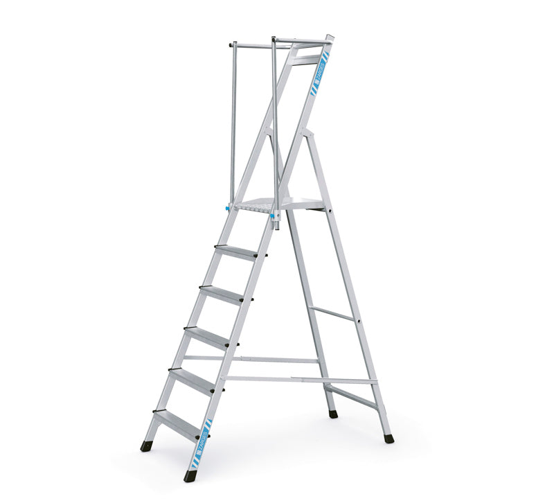 Zarges Safer Step Technology med sikkerhedsrifling og 80 mm dybe trin giver sikkert og uanstrengt fodfæste under alle arbejdsforhold. Den 3-dobbeltnittede trin-vangeforbindelse og holdbare aluminiumskonstruktion sikrer stabil support selv ved intensivt professionelt brug. Platformhøjden på 1490 mm placerer dig optimalt til de fleste indendørs arbejdsopgaver.