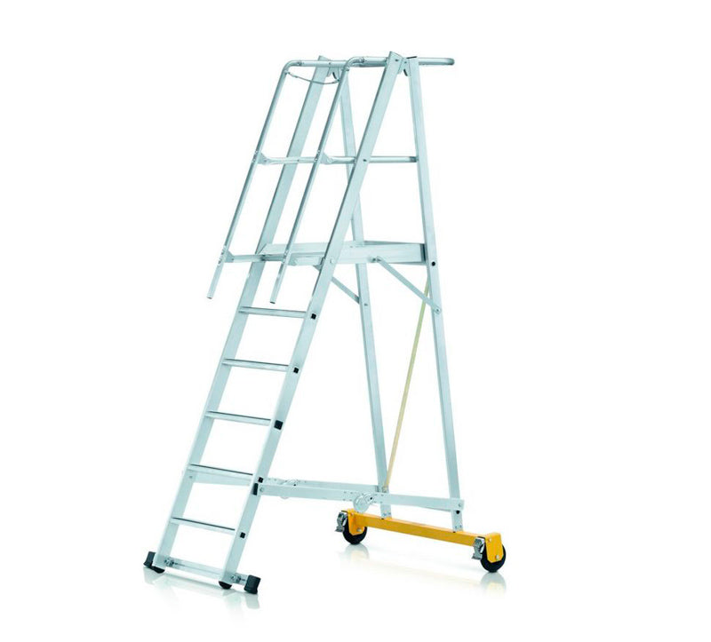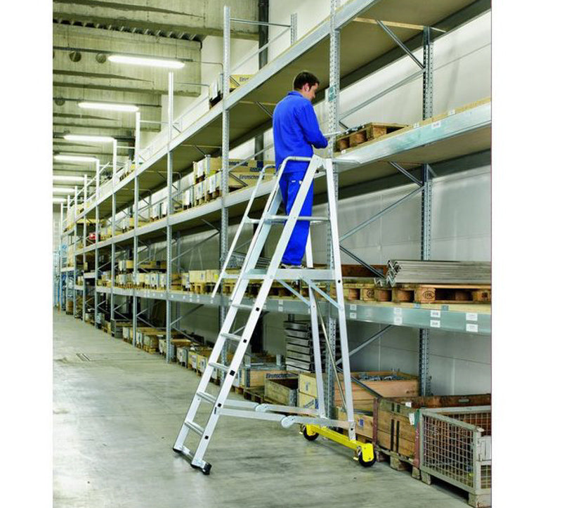 De 160 mm hjul med bremse gør det nemt at transportere stigen mellem arbejdsområder, mens det sammenklapelige design via hængsler i begge diagonalstivere sikrer pladsbesparende opbevaring. Det smalle understel med ekstra ballast giver optimal stabilitet uden at optage unødvendig gulvplads - en klar fordel i trange arbejdsmiljøer.