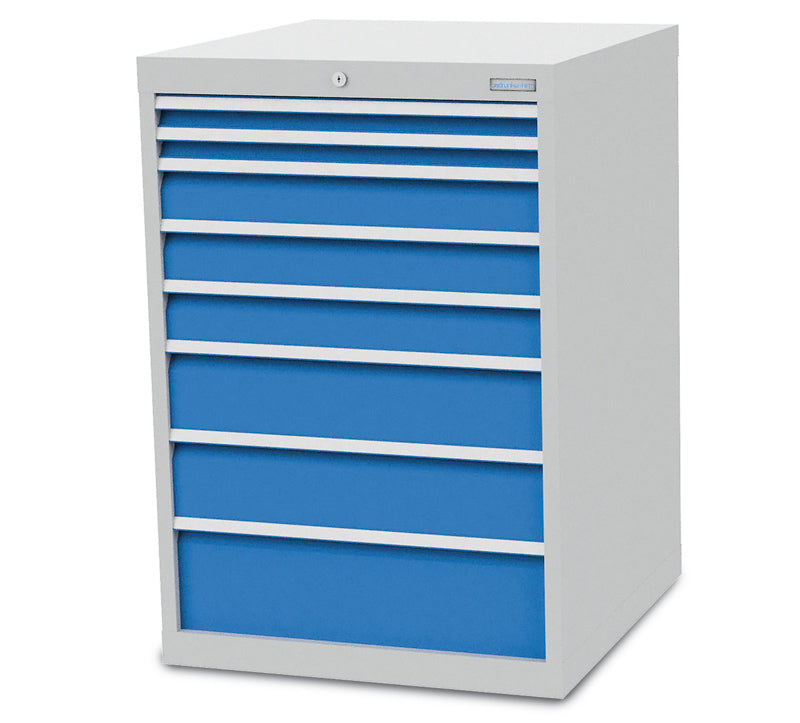Grå RAL 7035 kabinet og Blå RAL 5012 skuffefronter.